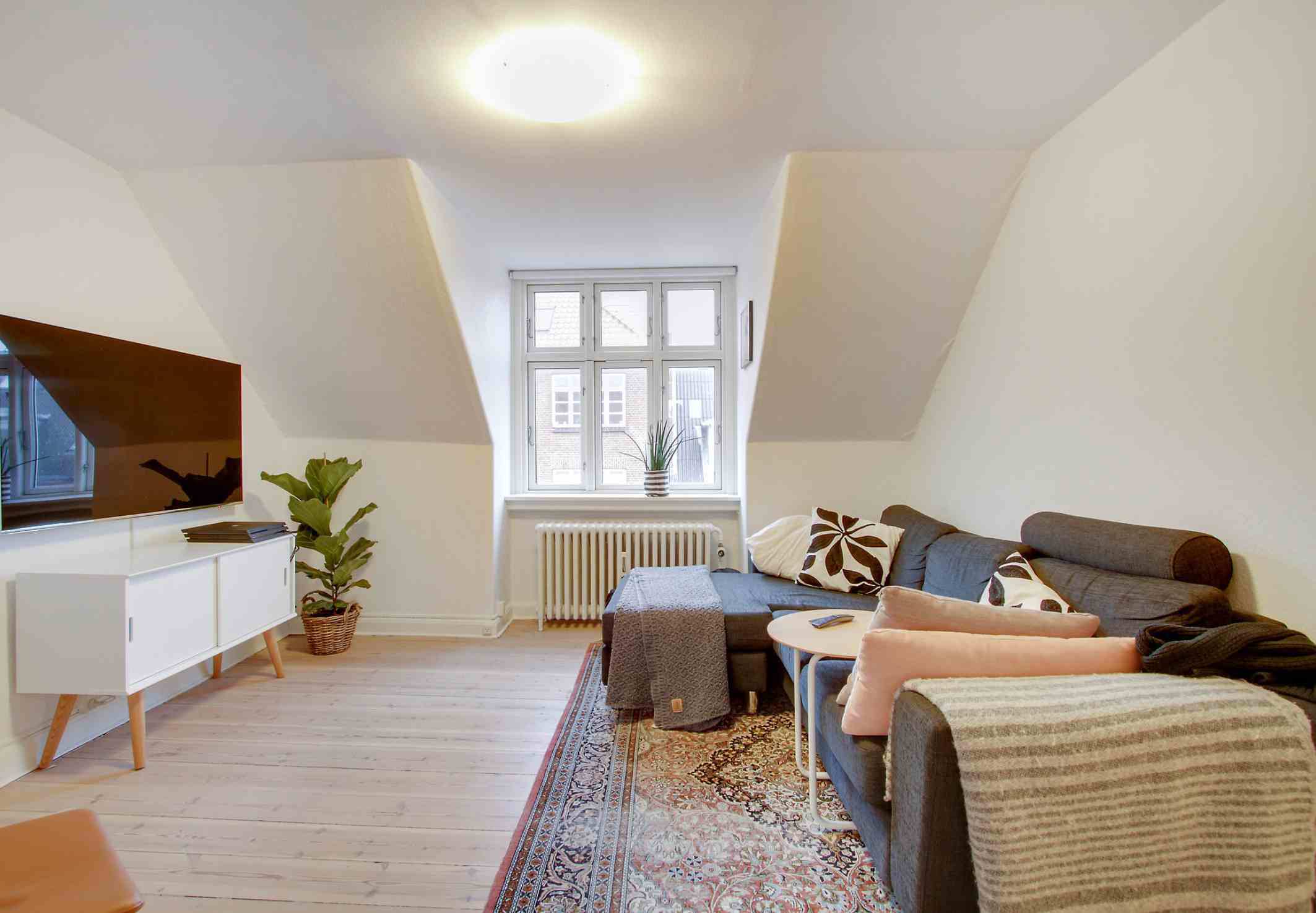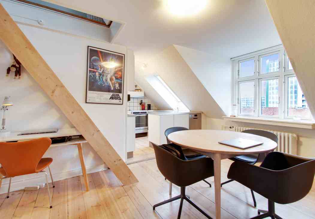 Lejligheden ligger på øverste etage med sydvendt stue og køkken, og har desuden en stor hems, der kan benyttes til soveværelse.